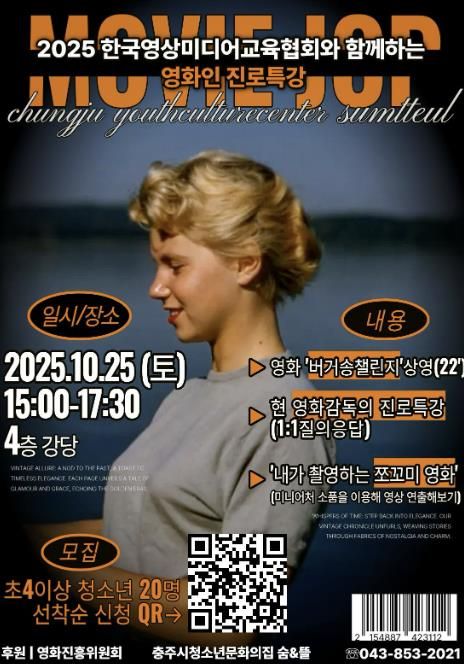 행사는 10월 25일 오후 3시부터 5시 30분까지 충주시청소년문화의집 숨·뜰 4층 강당에서 진행되며 ▲영화 ‘버거송 챌린지’ 상영(22분), ▲현직 영화감독과의 진로 특강 및 1:1 질의응답 ▲‘내가 촬영하는 쪼꼬미 영화(미니어처 소품을 이용한 영상 연출 활동)’ 등의 프로그램이 진행된다.