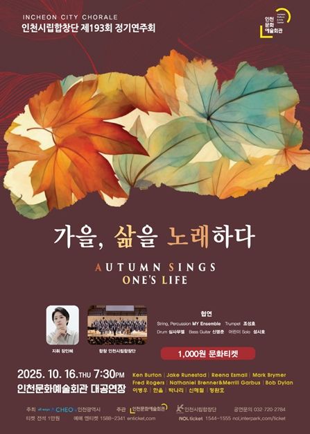 (포탈뉴스통신) 인천시립합창단(예술감독 윤의중)은 오는 10월 16일 오후 7시 30분, 인천문화예술회관 대공연장에서 깊어지는 가을의 정취와 함께 삶의 울림과 희망을 담은 무대를 선보인다.