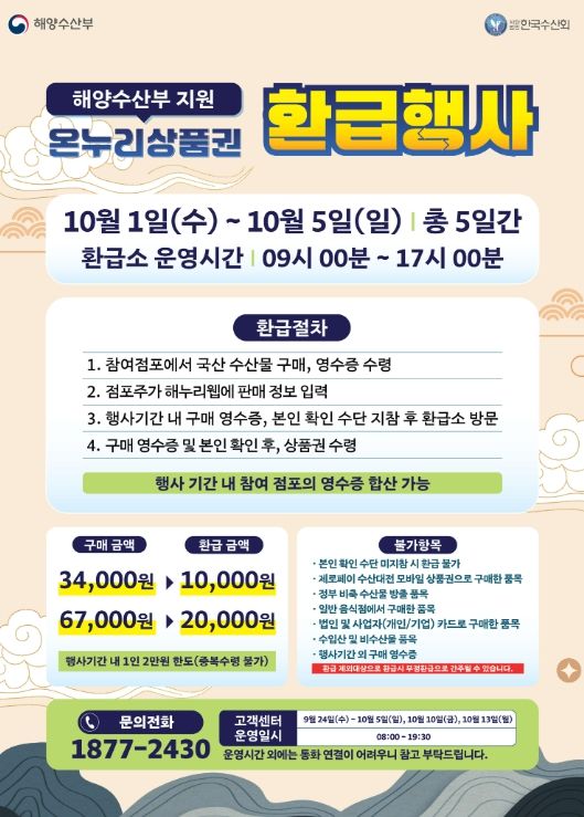 환급 기준은 ▲ 3만4천원 이상~6만7천원 미만 구매 시 1만원, ▲ 6만7천원 이상 구매 시 2만원이며, 1인 최대 2만원 한도로 지원된다.