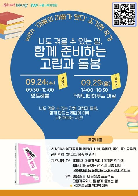 이번 특강의 주요 내용은 ▲『아빠의 아빠가 됐다』 저자의 고립 경험, ▲영케어러의 정의와 사회적 의미, ▲누구나 돌봄을 주고받는 일상, ▲고립 위기와 돌봄 연결의 중요성 등이다.