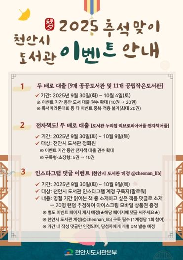 (포탈뉴스통신) 천안시도서관본부는 추석 연휴를 맞아 다양한 독서 이벤트를 운영한다고 29일 밝혔다.