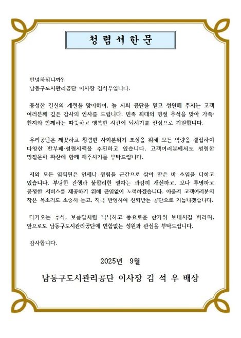 (포탈뉴스통신) 인천시 남동구 도시관리공단은 청렴 문화 정착을 위해 공사, 용역, 물품 관련 업체와 전 직원에게 ‘청렴 서한문’을 발송했다고 29일 전했다.