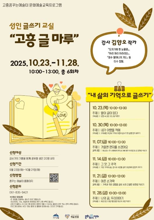 (포탈뉴스통신) 고흥군과 고흥군문화도시센터는 오는 10월부터 11월까지 '성인 글쓰기 교실: 고흥 글마루'를 운영한다고 밝혔다.