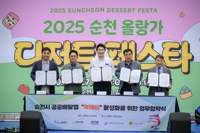 (포탈뉴스통신) 순천시는 지난 27일 시민로 일원에서 열린 순천 올랑가 디저트 페스타 행사에서 공공배달앱 ‘먹깨비’ 활성화를 위한 업무협약식을 개최했다.