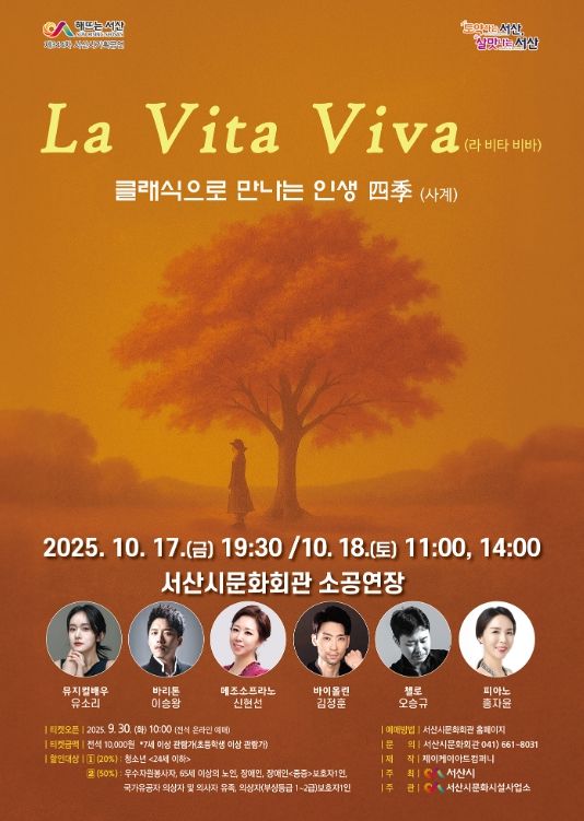 (포탈뉴스통신) 충남 서산시는 10월 문화회관의 기획공연으로 클래식 콘서트 ‘La Vita Viva(라 비타 비바): 클래식으로 만나는 인생 사계(四季)’를 마련했다고 29일 밝혔다.