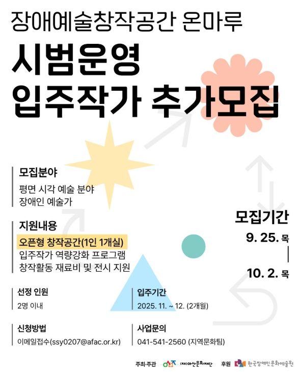 (포탈뉴스통신) (재)아산문화재단은 ‘2025년 장애예술 거점 창작공간 운영 지원사업 '장애예술창작공간 온마루'’에 참여할 장애인 예술가 2명을 10월 2일까지 추가로 모집한다고 밝혔다.