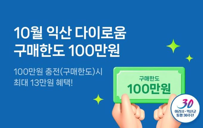 (포탈뉴스통신) 익산시가 이리시·익산군 통합 30주년과 시민의 날(10월 3일)을 기념해, 10월 한 달간 지역사랑상품권 '익산 다이로움'의 개인별 구매한도를 기존 60만 원에서 100만 원으로 확대한다고 30일 밝혔다.