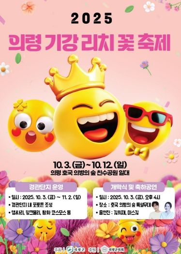 의령군은 오는 10월 3일부터 12일까지, 지정면 성산리 호국의병의 숲 친수공원 일원에서 ‘2025 의령 기강 리치꽃축제’를 개최한다.