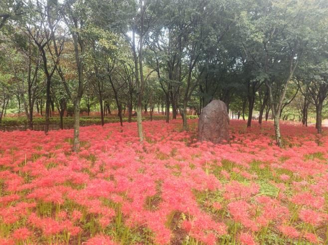 현재 휴양림 생태숲 산책로를 따라 만개한 붉은 꽃무릇은 군락을 이루며 장관을 연출해 평소와는 다른 풍경을 선사한다.