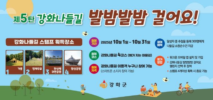 (포탈뉴스통신) 강화군은 10월 한 달간 강화나들길 활성화를 위해 ‘제5탄 강화나들길 발밤발밤 걸어요!’ 챌린지를 진행한다고 밝혔다.