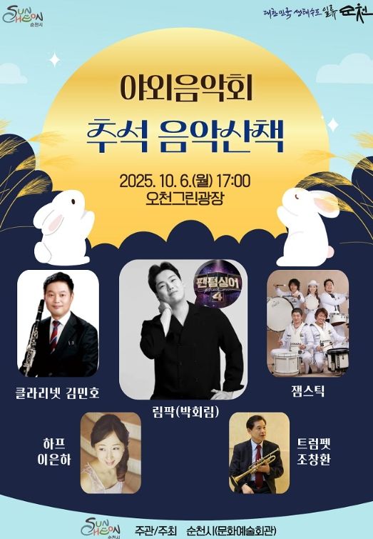 (포탈뉴스통신) 순천시 문화예술회관은 추석 명절을 맞아 시민과 관광객을 위한 야외음악회 '추석 음악산책'을 10월 6일 추석 당일 오후 5시에 오천그린광장에서 개최한다고 밝혔다.