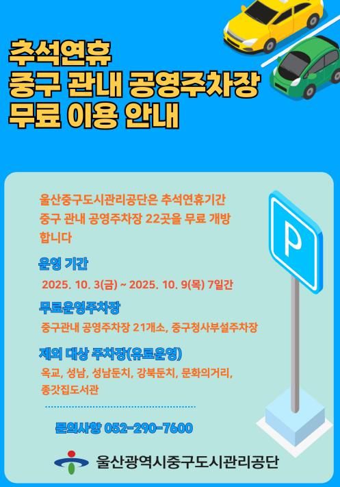 한편, 울산중구도시관리공단은 이용객의 안전과 편의를 위해 9월 24일부터 10월 2일까지 공영주차장 안전 점검 및 환경 정비를 실시한다.
