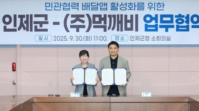 (포탈뉴스통신) 인제군은 9월 30일 군청 소회의실에서 민관협력 배달앱 ‘먹깨비’ 운영사와 업무 협약을 체결하고, 지역 소상공인 경영 안정과 군민 편익 증진을 위한 본격적인 협력에 나섰다.