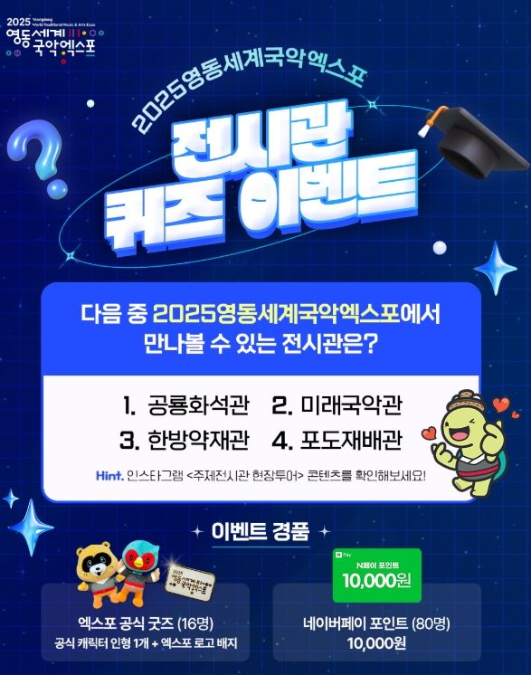 이번 이벤트는 2025영동세계국악엑스포(이하 ‘국악엑스포’)에서만 만나볼 수 있는 3개의 주제전시관 중 하나의 이름을 맞히는 퀴즈 형식으로, '주제전시관 현장투어' 콘텐츠에서 정답에 대한 힌트를 얻을 수 있다.