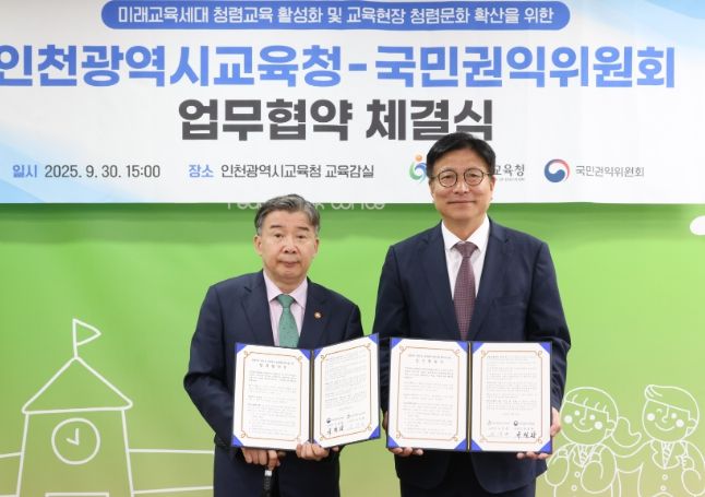 (포탈뉴스통신) 인천광역시교육청은 9월 30일 국민권익위원회와 청렴한 미래인재 양성과 교육 현장의 청렴 문화 확산을 위한 업무협약을 체결했다.