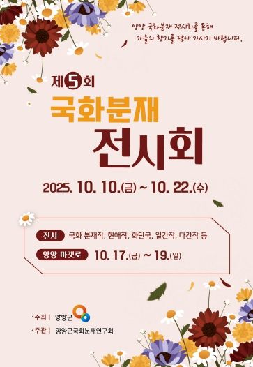 (포탈뉴스통신) 양양군 국화분재연구회(회장 윤종욱)는 오는 10일부터 22일까지 13일간 양양군농업기술센터에서 ’제5회 국화분재 전시회‘를 개최한다.