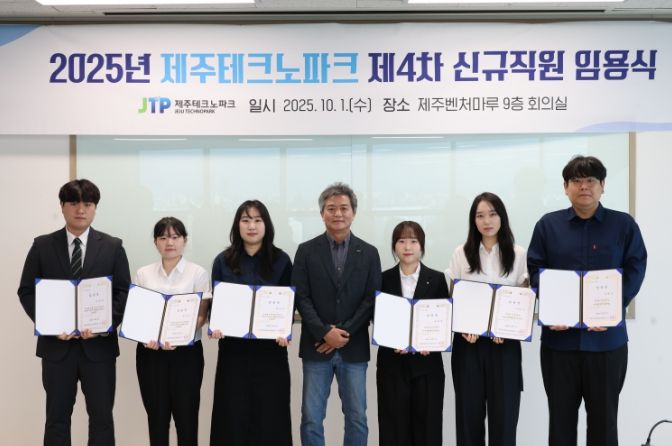 (포탈뉴스통신) 제주테크노파크(원장 지영흔, 제주TP)가 1일 제주벤처마루 9층 회의실에서 6명의 신규직원에게 임명장을 수여했다.