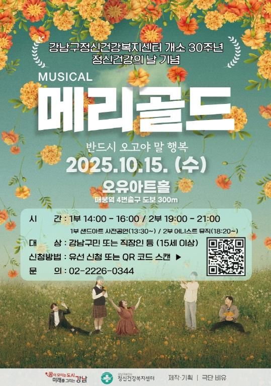 (포탈뉴스통신) 꿈이 모이는 도시, 미래를 그리는 강남구가 정신건강복지센터 개소 30주년과 세계정신건강의 날(10월 10일)을 기념해, 오는 10월 15일 오후 2시와 7시, 오유아트홀(남부순환로378길 34-9)에서 구민과 함께하는 특별 뮤지컬 ‘메리골드 – 반드시 오고야 말 행복’을 개최한다.