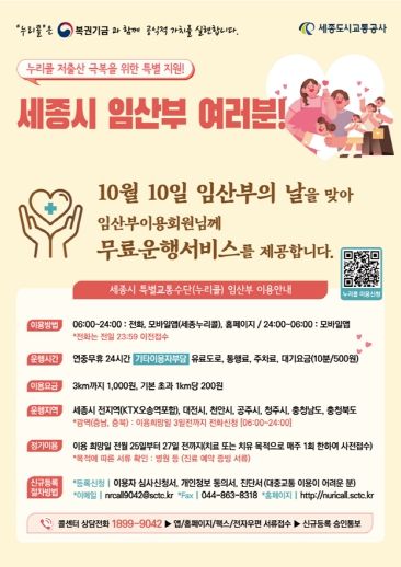 (포탈뉴스통신) 세종도시교통공사는 오는 10월 10일 ‘임산부의 날’을 맞아 이날 하루 특별교통수단 누리콜 차량을 무료로 운행한다고 밝혔다.