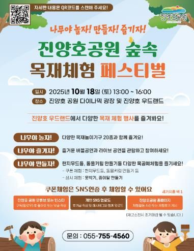 (포탈뉴스통신) 진주시는 오는 10월 18일 오후 1시부터 4시까지 진양호공원 다이나믹 광장과 진양호우드랜드 일원에서 『나무야 놀자! 만들자! 즐기자! 진양호 공원 숲속 목재체험 페스티벌』을 개최한다.