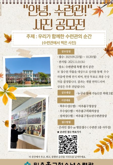 수련관에서의 소중한 순간을 담은 사진이라면 누구나 응모할 수 있으며, 청소년뿐 아니라 지역 주민도 참여할 수 있다.
