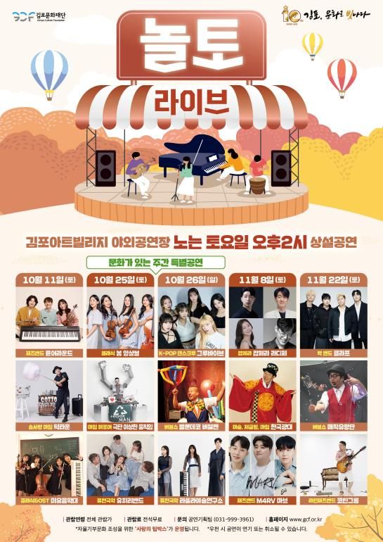 (포탈뉴스통신) (재)김포문화재단은 10월 11일부터 11월 22일까지 매월 둘째, 넷째 주 토요일마다 김포아트빌리지 야외공연장에서 하반기 토요상설공연 '놀토 라이브'를 개최한다고 밝혔다.
