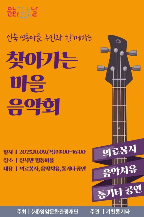 (포탈뉴스통신) (재)영암문화관광재단은 2025 문화가 있는 날 행사지원 사업으로 생활문화 동호회인 기찬통기타(대표:최문일)와 함께 신북 명동마을 주민을 대상으로 한 ‘찾아가는 마을 음악회’를 오는 10월 9일 한글날에 개최한다고 밝혔다.