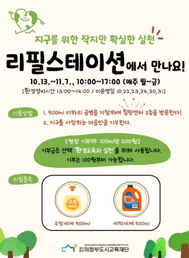 (포탈뉴스통신) (재)의정부도시교육재단은 10월 13일부터 11월 7일까지 매주 월요일부터 금요일, 오전 10시부터 오후 5시까지 힐링센터 2층에서 생활 속 친환경 실천 활동 ‘리필스테이션’을 운영한다.