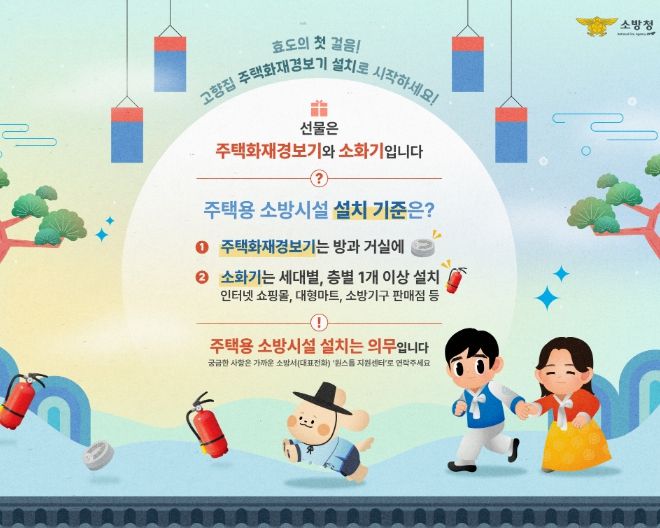 이 캠페인은 고향을 찾는 귀성객들이 부모님과 가족의 건강만큼이나 화재 안전에도 관심을 가져달라는 취지로 마련됐다. 소화기와 단독경보형 감지기만 설치해도 주택 화재 발생 시 신속히 대처할 수 있어 인명 피해를 크게 줄일 수 있다. 그래서 ‘안전은 최고의 선물’이라는 메시지와 함께 주택용 소방시설을 선물하는 문화를 권장하고 있다.