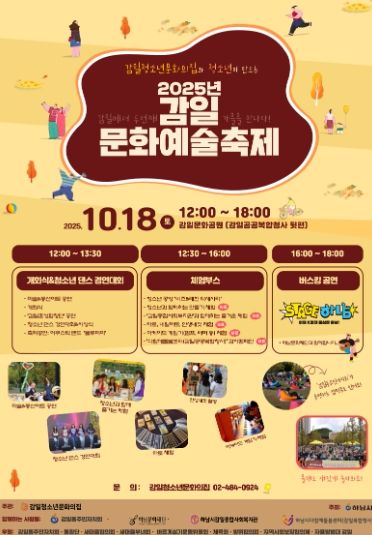 (포탈뉴스통신) 하남시 감일청소년문화의집은 오는 10월 18일 오후 12시부터 18시까지 감일문화공원(감일공공복합청사 뒷편)에서 '제2회 감일문화예술축제'를 개최한다.