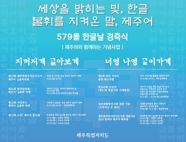 (포탈뉴스통신) 제주특별자치도는 훈민정음 반포 579돌 한글날을 맞이해 오는 9일 오전 10시 제주문예회관에서 한글날 경축식을 개최한다.