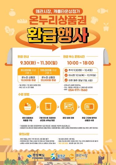 (포탈뉴스통신) 칠곡군은 전통시장 활성화와 지역경제 활력 제고를 위해 9월 30일(화)부터 11월 30일(일)까지 전통시장 구매 고객을 대상으로 온누리상품권 환급행사를 진행한다.