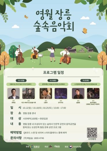 (포탈뉴스통신) 영월군은 오는 10월 12일, 18일, 25일 오후 3시부터 5시까지 세계유산 장릉 경내에서 ‘영월 장릉 숲속 음악회’를 개최한다.
