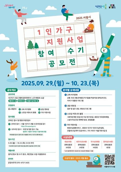 (포탈뉴스통신) 서울시가 1인가구 지원사업의 성과를 공유하고 참여자들의 생생한 목소리를 담아내기 위해 '2025년 1인가구 지원사업 참여 수기 공모전'을 개최한다.