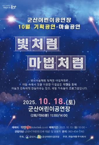 (포탈뉴스통신) 군산어린이공연장이 오는 10월 18일 어린이들의 상상력과 창의력을 자극하는 특별한 체험형 공연 '빛처럼 마법처럼'을 선보인다.