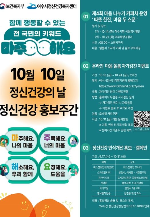 (포탈뉴스통신) 여수시는 정신건강의 날(10월 10일)을 기념해 10월 10일부터 24일까지 ‘2025년 정신건강 홍보주간’을 운영한다.