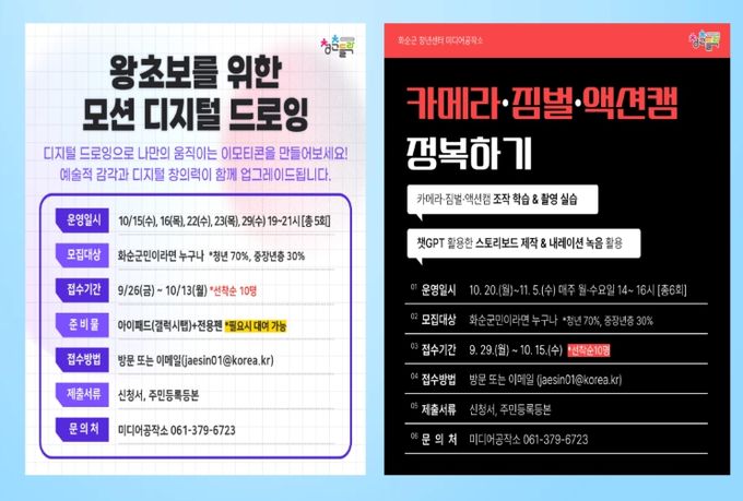 (포탈뉴스통신) 화순군(군수 구복규)은 오는 10월 15일과 20일 화순군 청년센터(청춘들락) 미디어공작소에서 영상 제작과 디지털드로잉 분야의 창의적 미디어 교육 프로그램을 시작한다고 밝혔다.