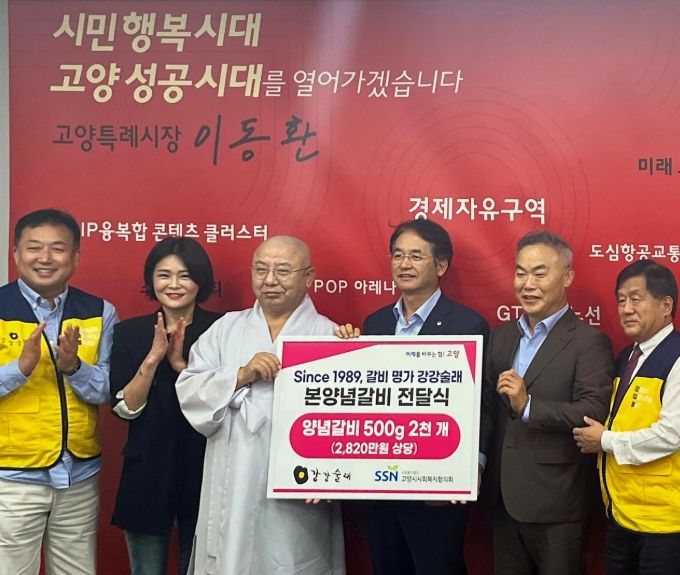 (포탈뉴스통신) ㈜전한의 외식브랜드 강강술래(대표 노상환)가 10월 10일, 고양특례시에 본양념갈비 500g 2,000개(2,820만 원 상당)를 기탁했다. 이번 전달식은 고양특례시청 열린시장실에서 진행됐으며, 이동환 고양특례시장, 김민숙 고양특례시의원(고양, 관산, 원신), 노상환 강강술래 대표, 김응화 고양시사회복지협의회 회장이 함께 자리했다.