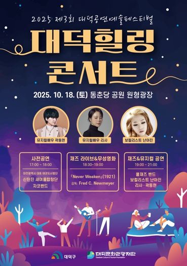 (포탈뉴스통신) 대덕문화관광재단은 오는 18일 동춘당 원형광장에서 ‘2025 대덕힐링콘서트’를 개최한다고 밝혔다.
