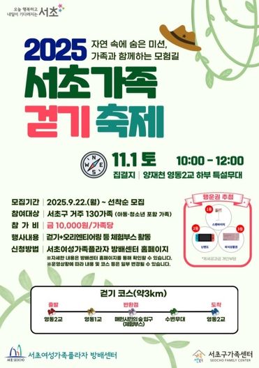 (포탈뉴스통신) 서울 서초구는 서초여성가족플라자 방배센터, 서초구 가족센터와 함께 11월 1일 서울의 대표적인 생태하천인 양재천에서 ‘2025 서초가족 걷기 축제’를 개최한다고 밝혔다.