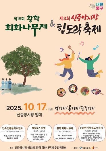 (포탈뉴스통신) 서울 중구 황학동의 오랜 전통을 품은‘황학회화나무제’와 젊은 감각이 살아 있는‘신중앙시장 힙도락(HIP:道樂) 축제’가 오는 17일 오후 2시에 함께 열린다. 두 축제는 2023년부터 연계 개최해, 황학동의 가을을 더욱 풍성히 채우고 있다.