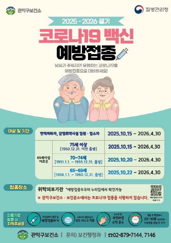 (포탈뉴스통신) 관악구가 호흡기 질환이 증가하는 동절기 대비, 코로나19 감염 고위험군을 대상으로 코로나19 백신 무료 접종을 실시한다.