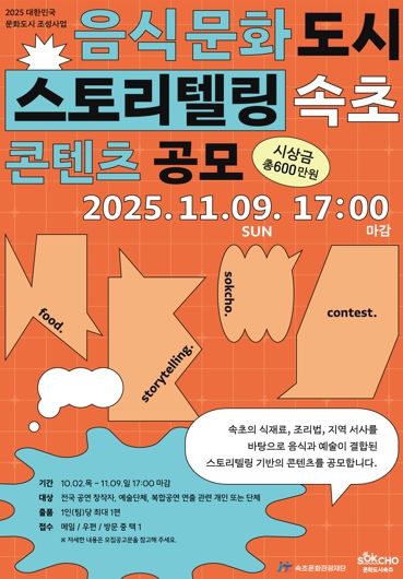 자세한 사항은 속초문화관광재단 누리집과 공식 SNS 채널에서 확인할 수 있고, 관련 문의는 문화도시센터 문화산업팀으로 하면 된다.
