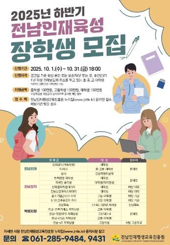 (포탈뉴스통신) 전라남도와 전남인재평생교육진흥원은 실질적인 교육기회 보장과 미래인재로의 성장, 지역 정착을 지원하기 위한 2025년 하반기 전남인재육성 장학생을 오는 31일까지 모집한다.