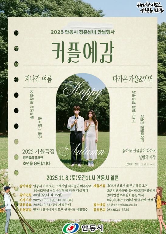모집 대상은 안동시에 거주하거나 안동 소재 기업에 재직 중인 1980~1993년생 미혼남녀로, 총 30명(남녀 각 15명)을 선발한다. 신청 접수는 이메일을 통해 이뤄지며, 참가신청서와 함께 재직증명서, 혼인관계증명서 등 증빙서류를 제출해야 한다. 최종 선정 결과는 10월 31일 개별 안내될 예정이다.