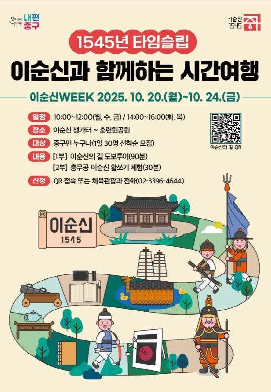 도보투어는 약 1.3km, 90분 일정으로, 중구 곳곳에 남은 이순신 장군의 흔적을 따라가는 여정이다. 도보투어 후에는 활쏘기 체험도 이어진다.