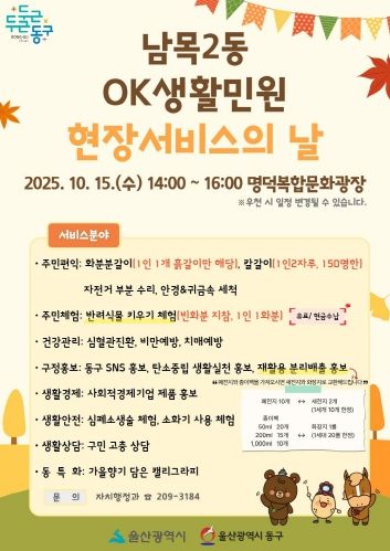 (포탈뉴스통신) 울산 동구는 오는 10월 15일 오후 2시부터 4시까지 명덕복합문화광장에서 ‘남목2동 OK생활민원 현장서비스의 날’ 행사를 개최한다.