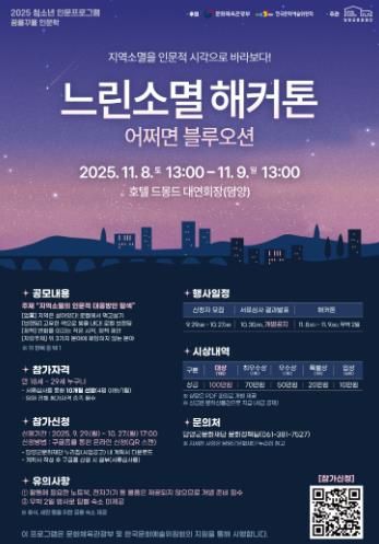 (포탈뉴스통신) 담양군문화재단은 오는 11월 8일부터 9일까지 지역소멸 대응 인문사회적 문제해결방안을 탐색하는 「느린소멸 해커톤」을 개최한다고 밝혔다.