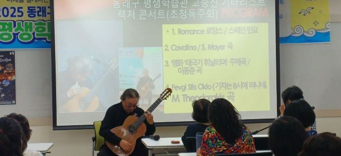오보에, 플루트, 성악, 시낭송 연주에 이어 부산 출신 클래식 기타리스트 고충진의 연주로‘알함브라 궁전의 추억’,‘가을밤’,‘그리움만 쌓이네’등 클래식 명곡부터 동요, 영화음악, 오페라, 팝송에 이르기까지 총 16곡을 선보이며 배움과 예술이 어우러진 감동의 무대를 선사했다.