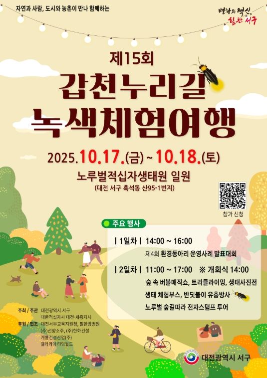 (포탈뉴스통신) 대전 서구는 이달 17일부터 18일까지 노루벌 적십자생태원에서 자연과 환경을 사랑하는 시민들을 위한 ‘제15회 갑천누리길 녹색체험여행’을 대한적십자사 대전·세종지사와 공동으로 개최한다.